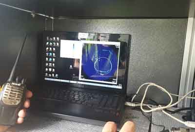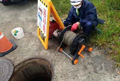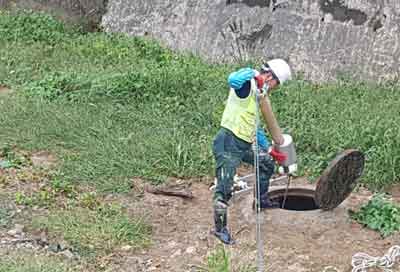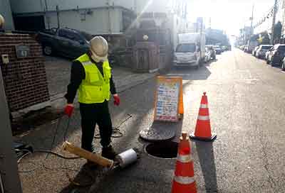 초음파 발생장치인 SONAR 프로브를 맨홀에 투입하고 있다.